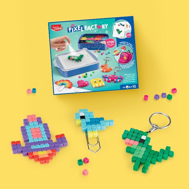 A MAPED CREATIV „Pixel Factory” készségfejlesztő különlegessége, hogy a víz erejét használva állnak össze a pixelek, ezzel megkönnyítve a gyerekek számára a folyamatot. A készlet 1110 db pixelnégyzetet, és 25 db különböző nehézségű sablont tartalmaz, melynek köszönhetően mindenki megtalálja az életkorához és ügyességéhez megfelelőt.