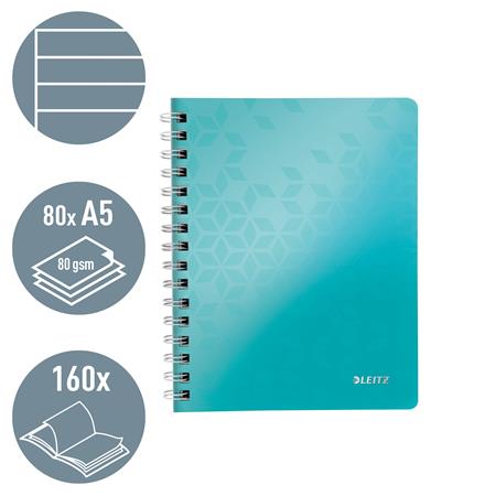 KezdőlapIrodaszerekIrodai papíráruFüzetek, gyűrűskönyvbetétekSpirálfüzet, A5, vonalas, 80 lap, LEITZ "Wow", jégkék
