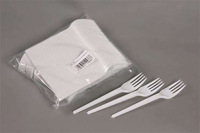 Fehér, műanyag eldobható villa, kerti partik, büfék és fesztiválok elengedhetetlen kelléke.